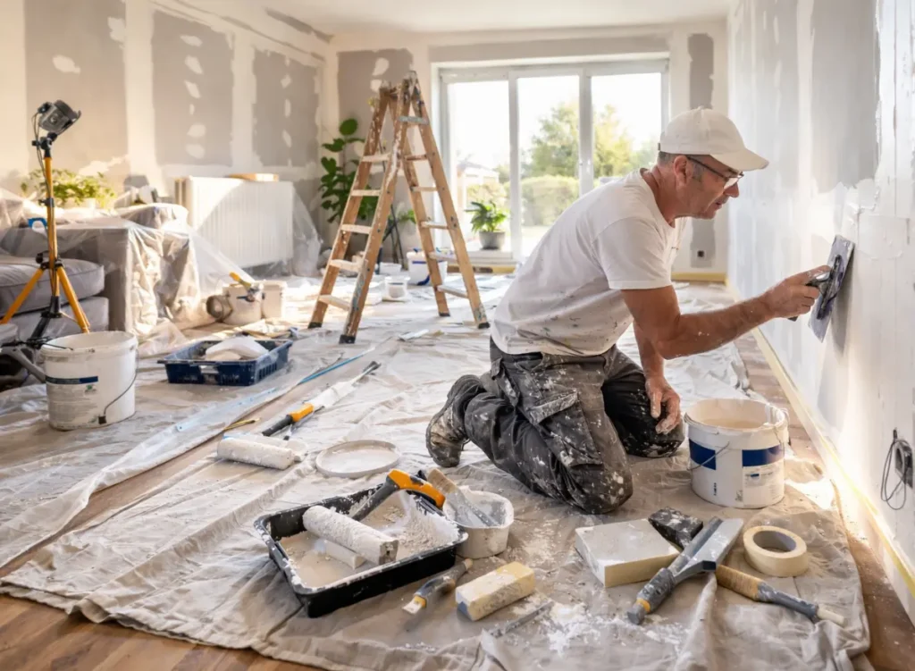 Remise en état des murs, réparation des imperfections, application de peinture ou de revêtements muraux.