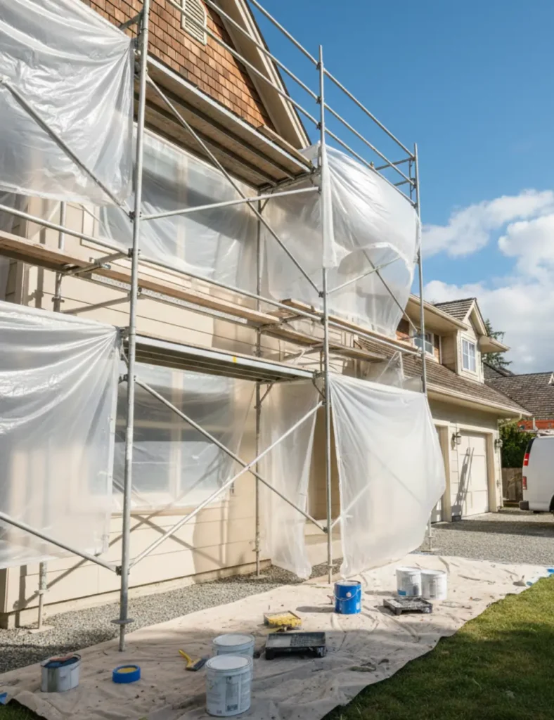 Application de peintures spécifiques sur débords de toiture, gouttières et habillages PVC afin de protéger les surfaces et harmoniser l’ensemble de la façade.
